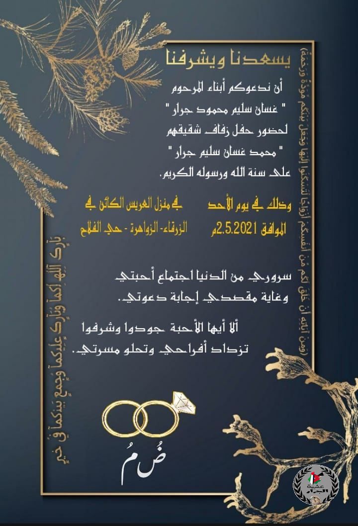 الف مبارك ابن العم محمد غسان سليم جرار بمناسبة الزفاف تتقدم عشيرة الجرار بالتهنئة و التبريكات من ابن العم محمد غسان سليم جراربمناسبة زفافه يوم الأحد الموافق ٢/٥/٢٠٢١ في الزرقاء الف مبارك 29/04/2021 09:05 pm 1,177