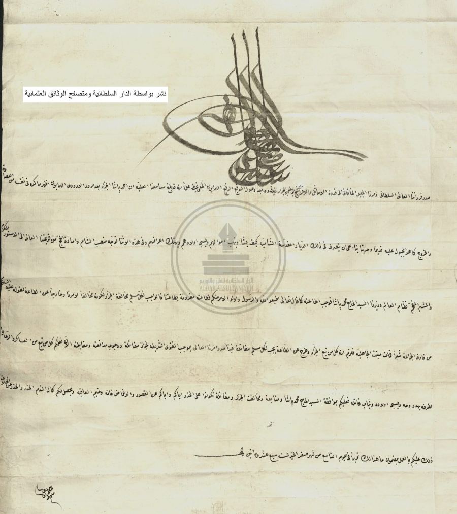 فرمان السلطان سليم الثالث للشيخ يوسف الجرار (شيخ جبل نابلس). عام 1802م.