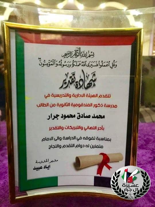 و ذلك لتفوقه بدراسته بالثانوية العامة