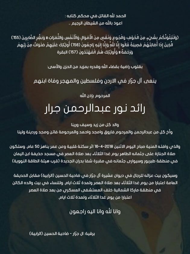 ينعى آل جرّار في الاردن وفلسطين والمهجر وفاة ابنهم