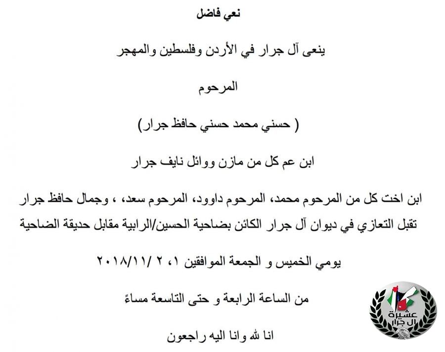 تنعي عشيرة ال جرار في الوطن والخارج ابن العم المرحوم ( حسني محمد حافظ جرار ) ابو حافظ تقبل التعازي في فلسطين / نادي جنين الرياضي في مدينة جنين ابتداء من اليوم بعد صلاة العصر ..تقبل التعازي في الاردن / ديوان عشيرة ال جرار يومي الخميس و الجمعة من الساعة 4 الى الساعة 9 مساءا.انا لله وانا اليه راجعون